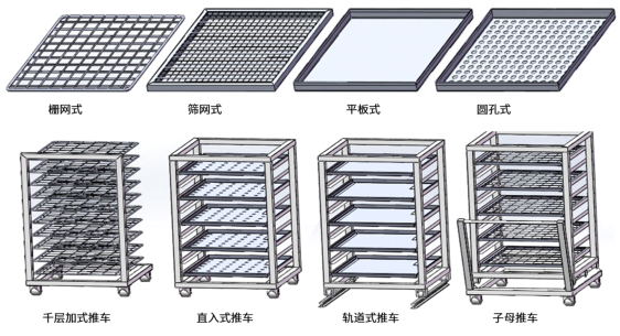 7、烘箱内部:可选分层式隔板、分层式网板、分层式托盘、小车式隔板、小车式网板、小车式托盘、手动台车、电动台车、千层架推车、子母推车、轨道式推车、等等。